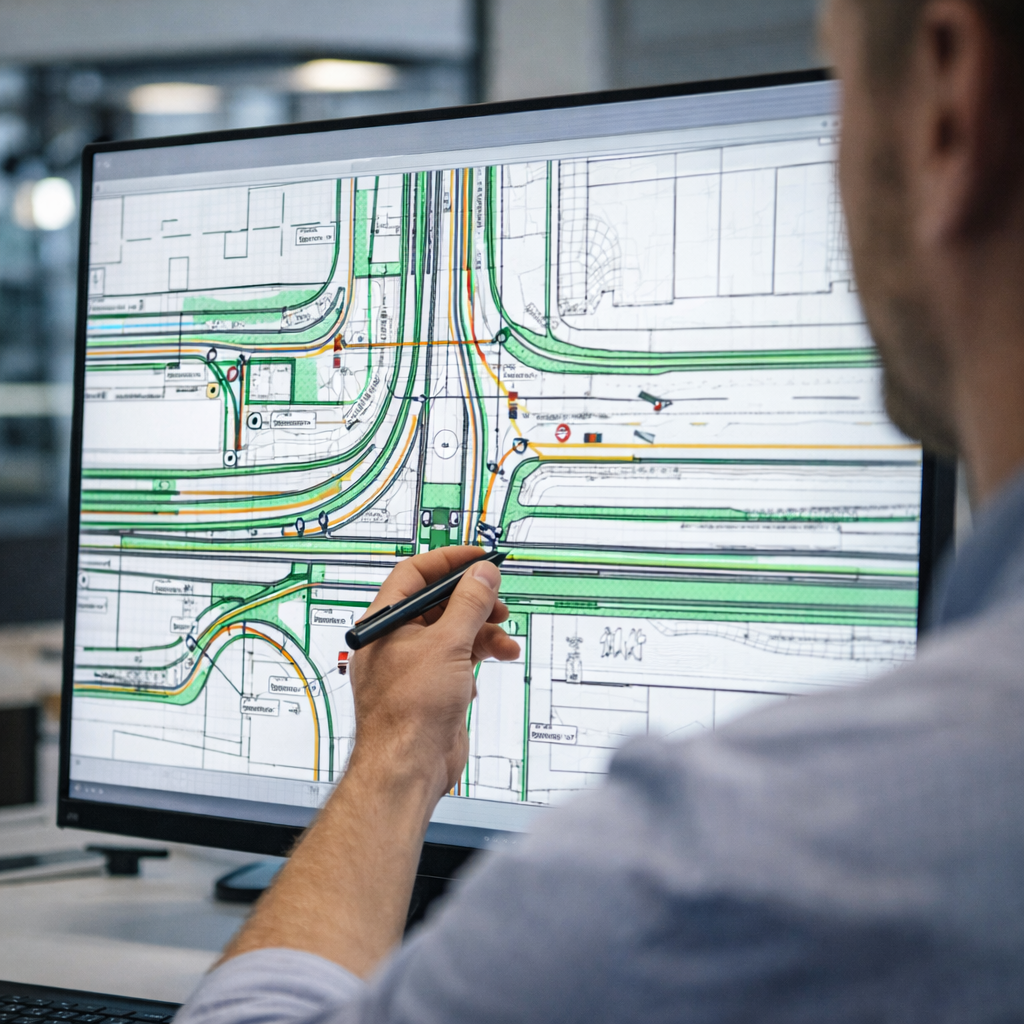 Technical professionals preparing circulation diagrams, traffic movement drawings, and infrastructure layouts supporting engineering studies.